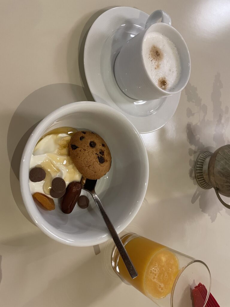 特に美味しかったのは、濃厚なギリシャヨーグルトに、クレタ島産の蜂蜜と香ばしいナッツをかけたもの。濃厚なヨーグルトと甘い蜂蜜の組み合わせが絶妙で、毎日おかわりしていました。さらに贅沢に、サクサクのクッキーを乗せて食べるのが私のお気に入り!