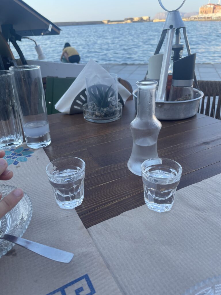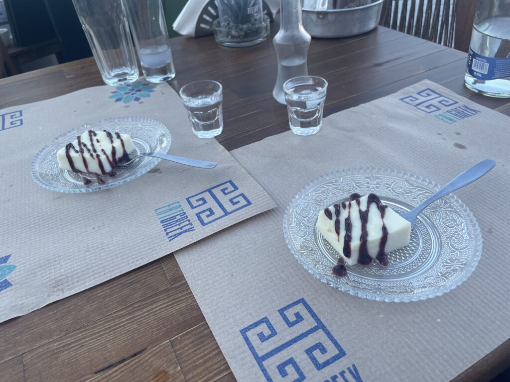 食事を終えると、お店の方からデザートと食後酒のラキをサービスしていただきました。ラキは、クレタ島でよく飲まれる蒸留酒で、アルコール度数が高いのですが、食後に飲むとスッキリとして、とても美味しかったです。