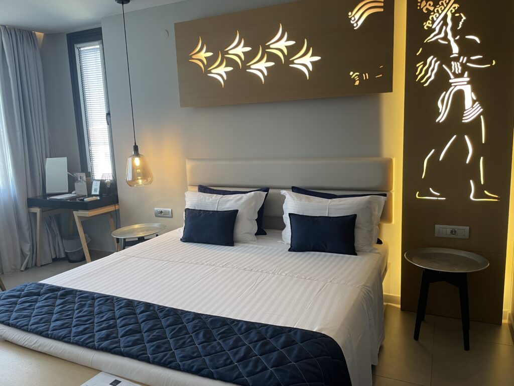 白と青を基調とした清潔感のある部屋で、広くて綺麗なベッドがイラクリオンらしいライトアップに囲まれていました。