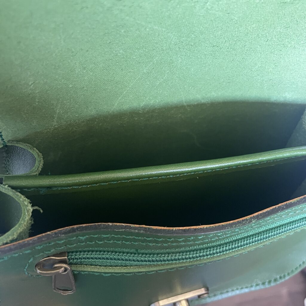 この緑色の革鞄、本当に買って大正解でした!最近のお出かけは、いつもこの子と一緒なんです♪