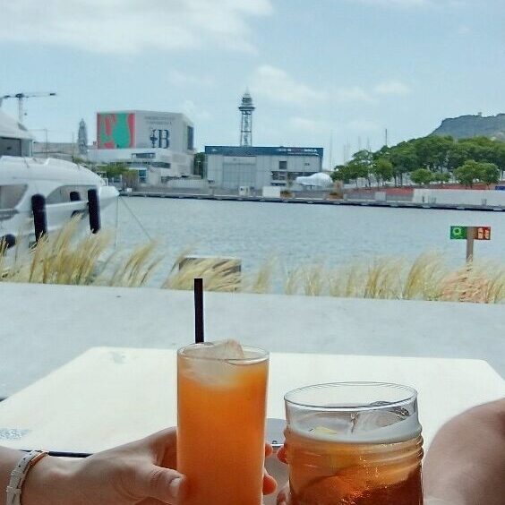 コロンブスの塔を見学した後、バルセロネータビーチへ向かうことにしましたが、少し疲れてきたので、途中のカフェで休憩することにしました。カフェの名前は覚えていないのですが、海沿いのテラス席が気持ちの良いお店でした。