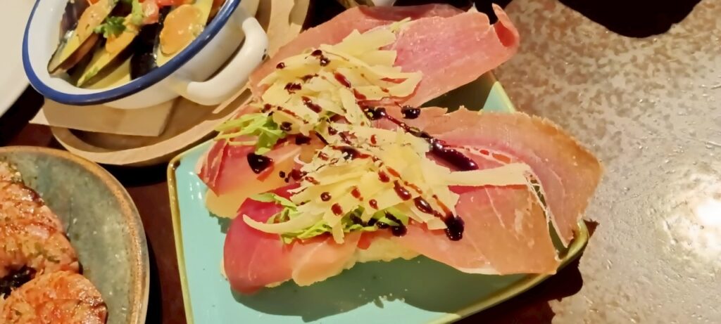 タパスは「Gambas al Ajillo」、つまりガーリックシュリンプと、「Steamed Mussles in a Creamy Curry」、ムール貝のカレークリーム煮込みを注文することに。そして、タパスには欠かせない生ハムが乗ったバケッドも忘れずに。